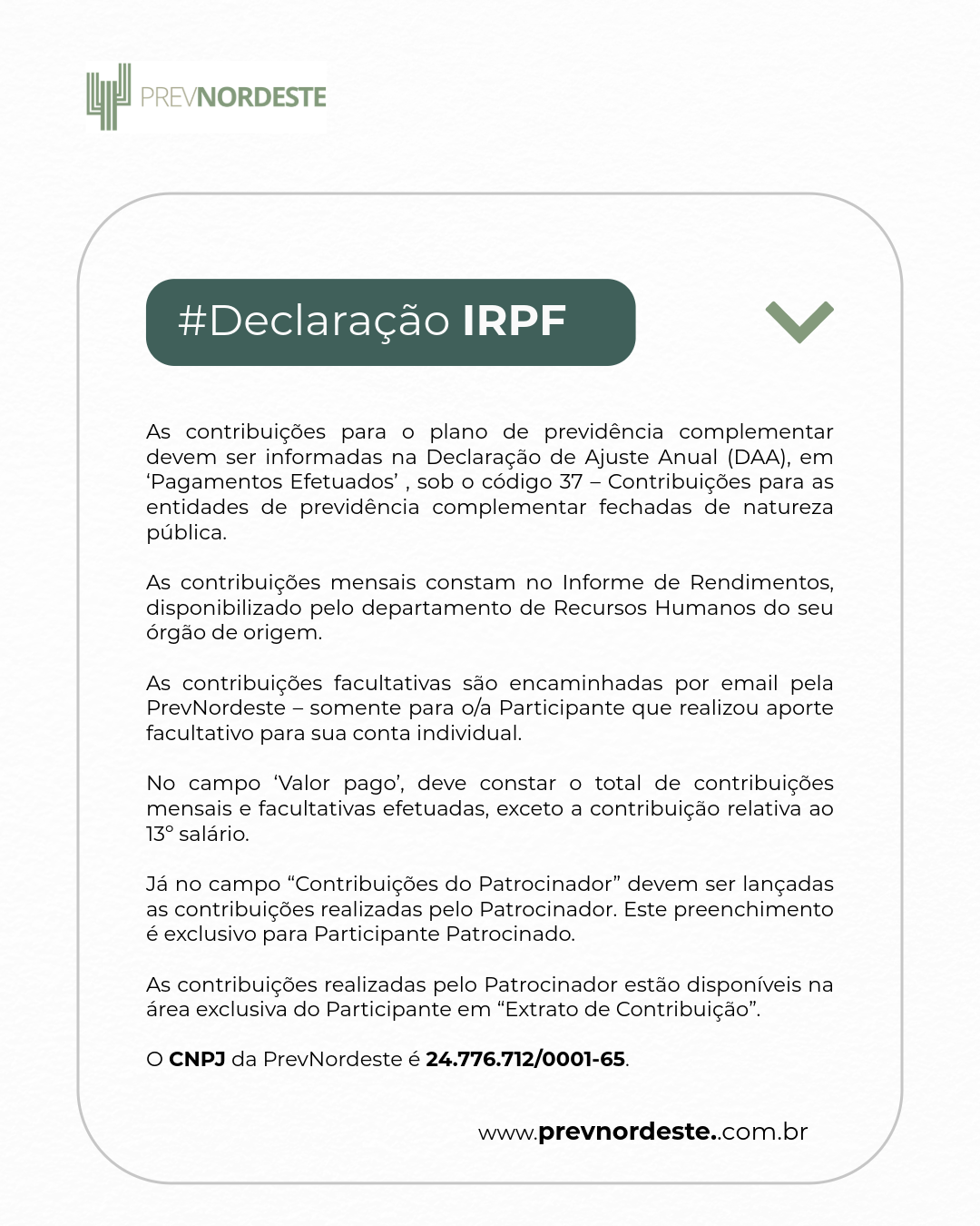 • Contribuições Facultativas: Os comprovantes referentes aos aportes realizados diretamente à Fundação são disponibilizados pela própria PrevNordeste.